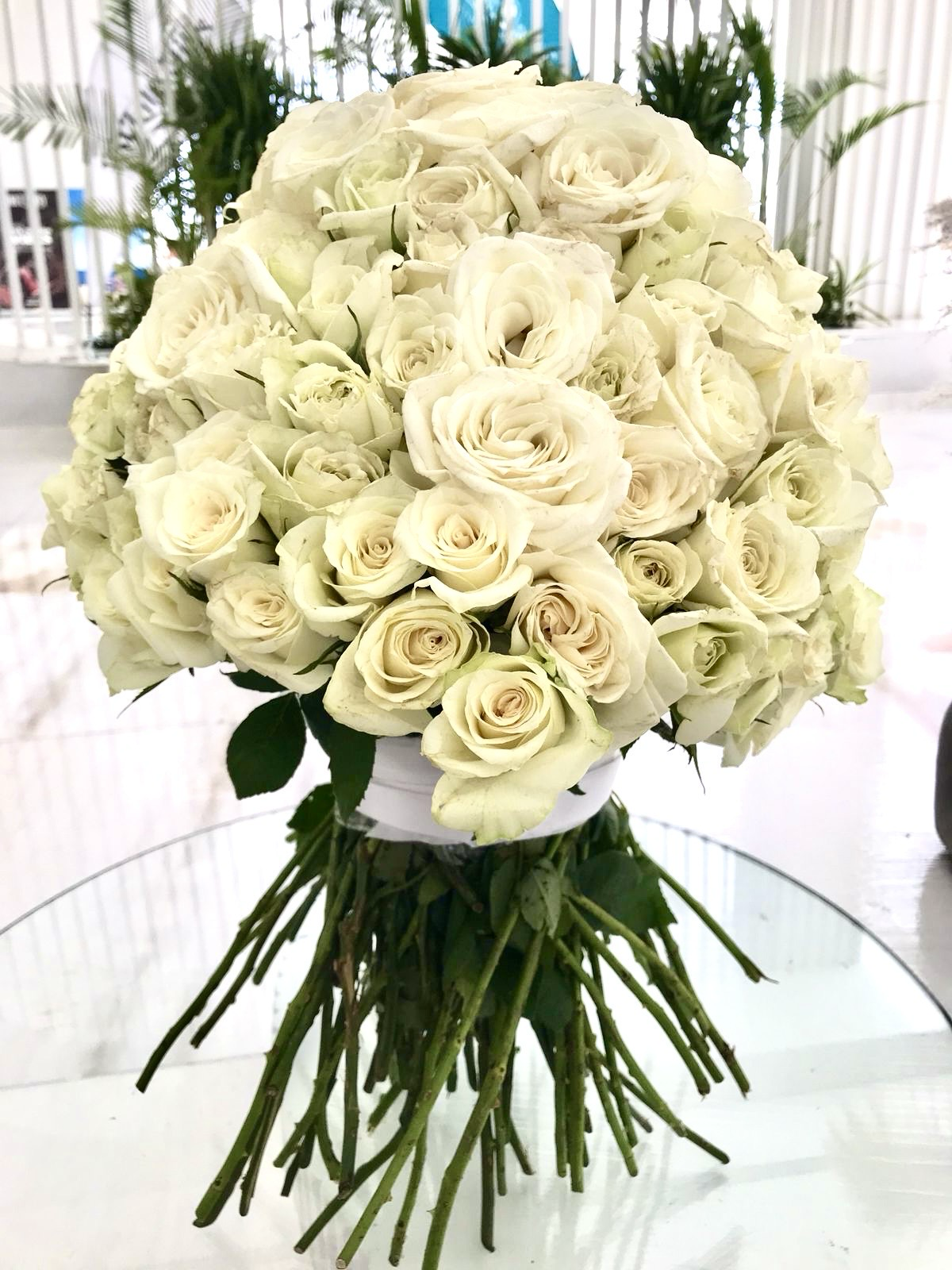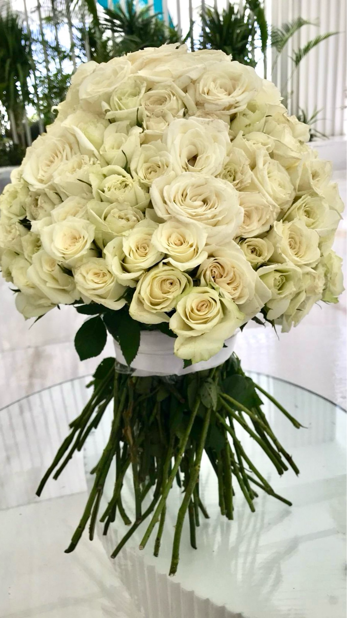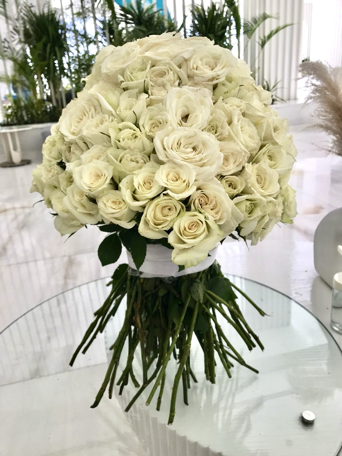Букет премиум-класса из 141 белой розы, с белой атласной лентой.