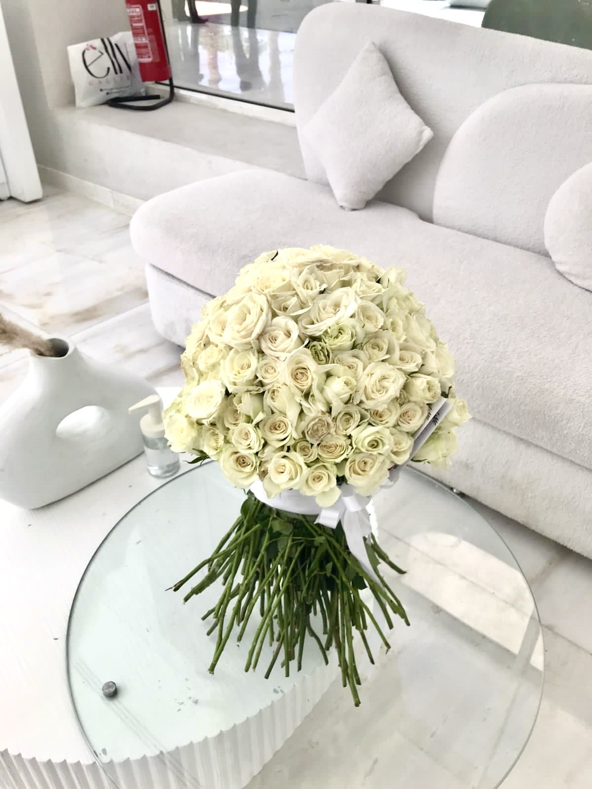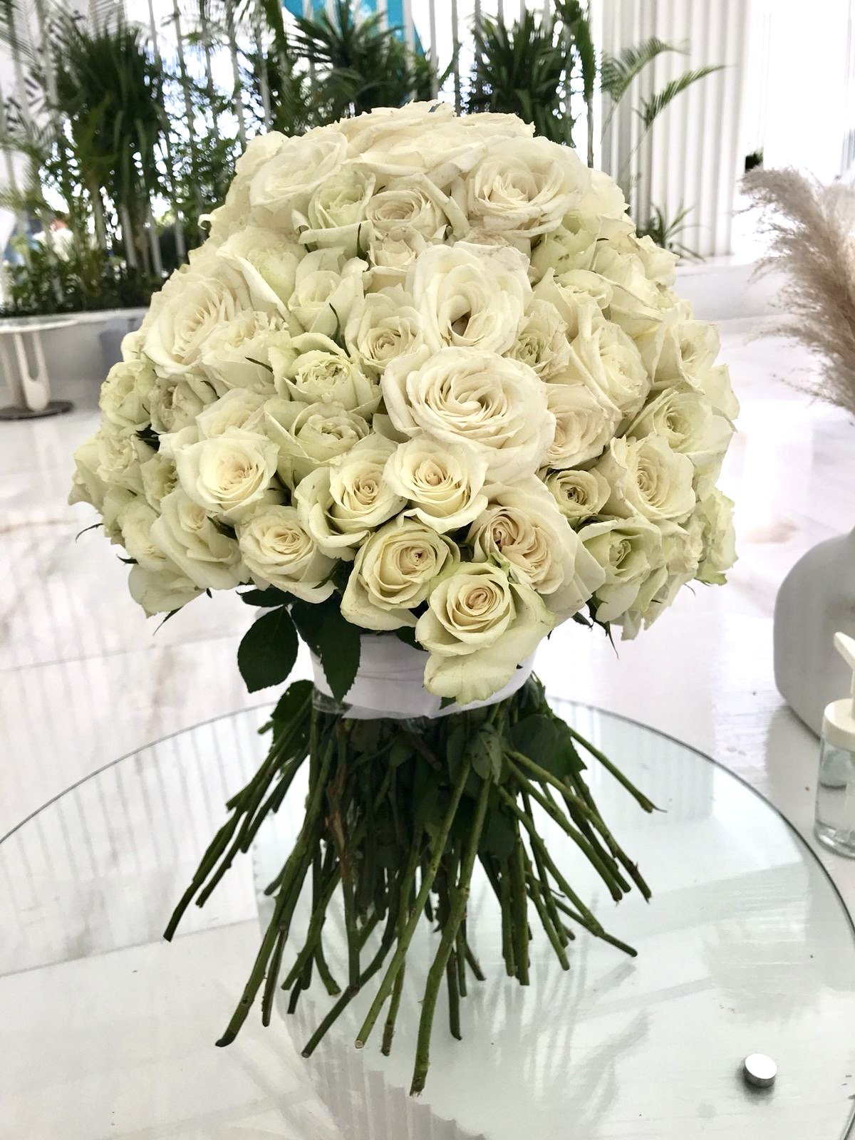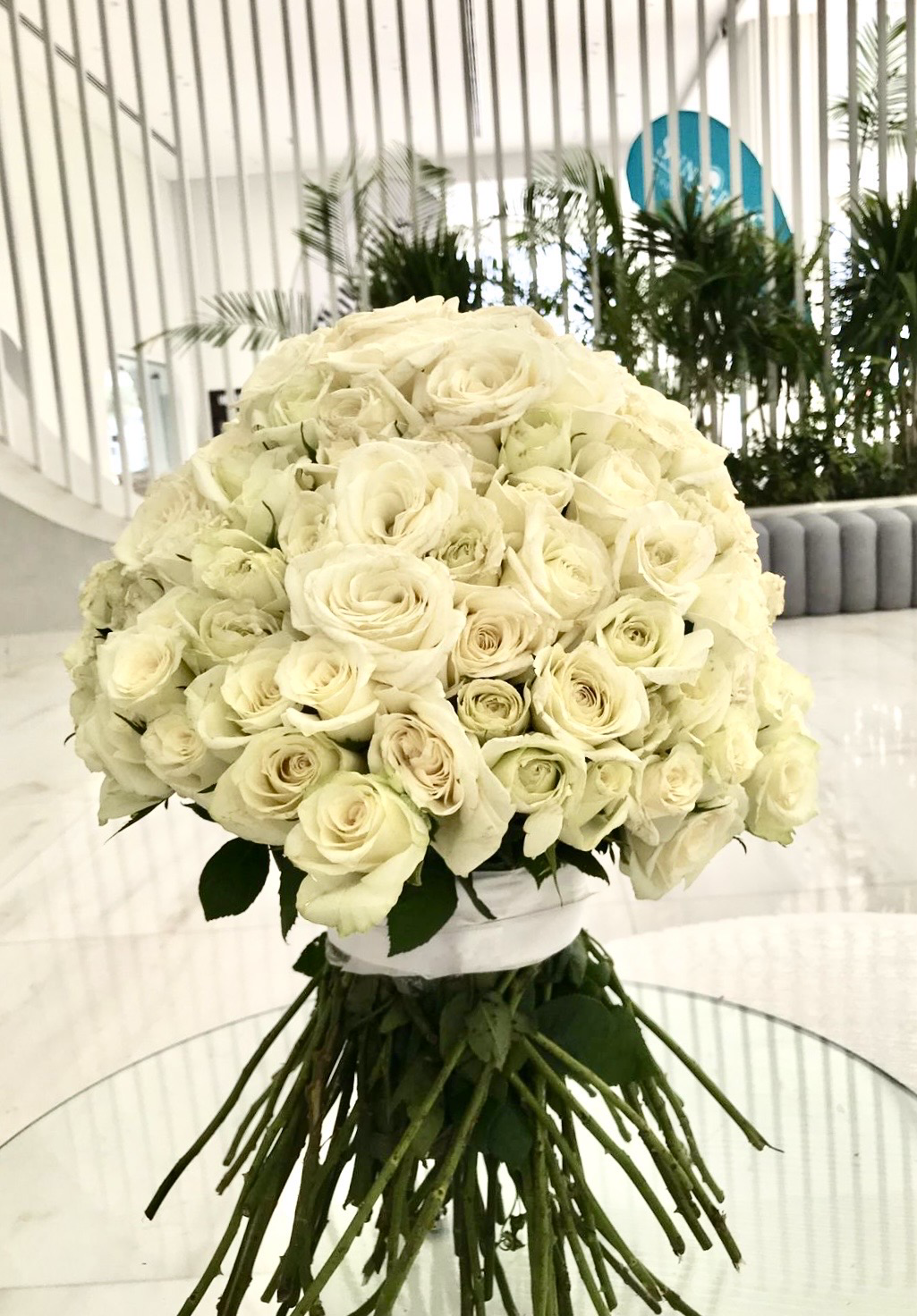Букет премиум-класса из 141 белой розы, с белой атласной лентой.