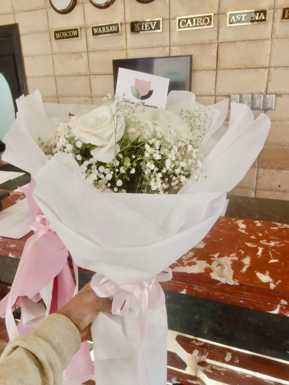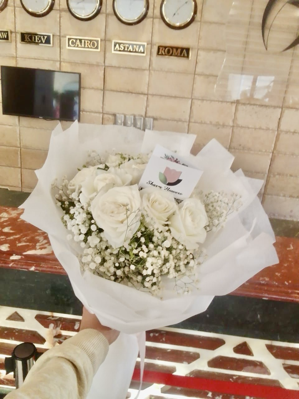 7 белых роз в дизайнерской упаковке
