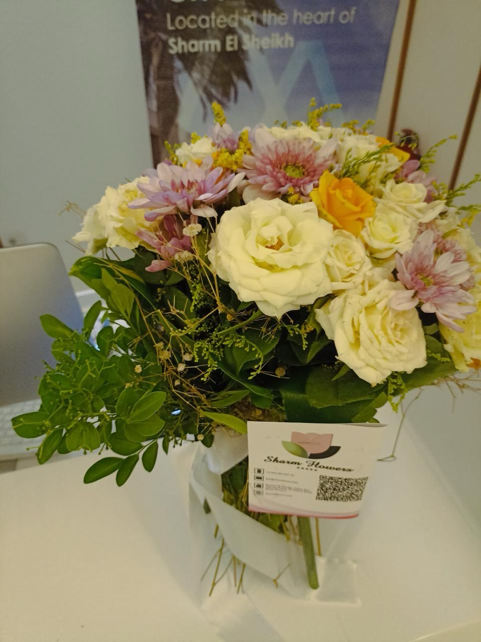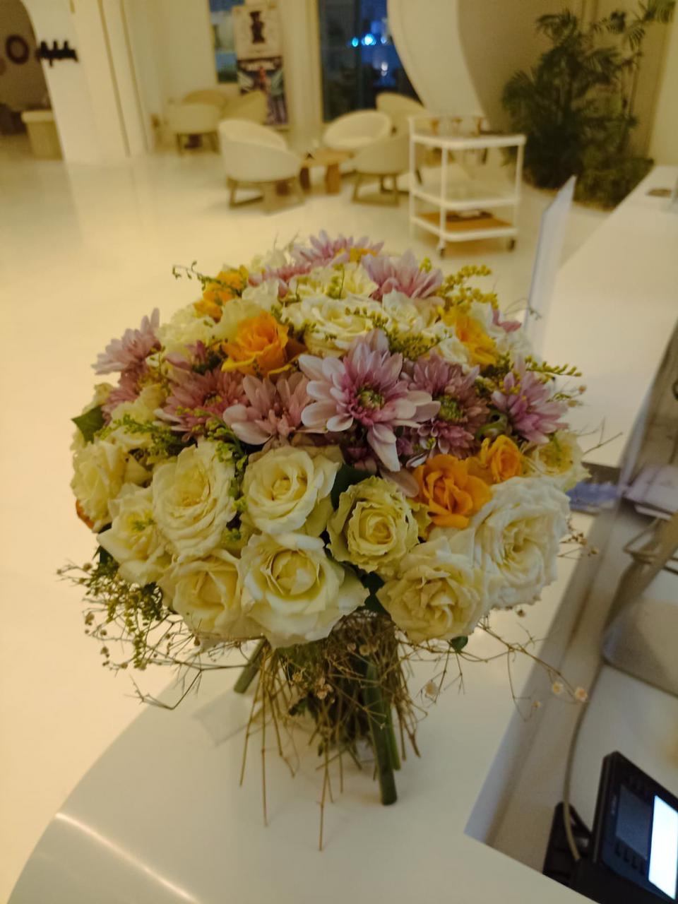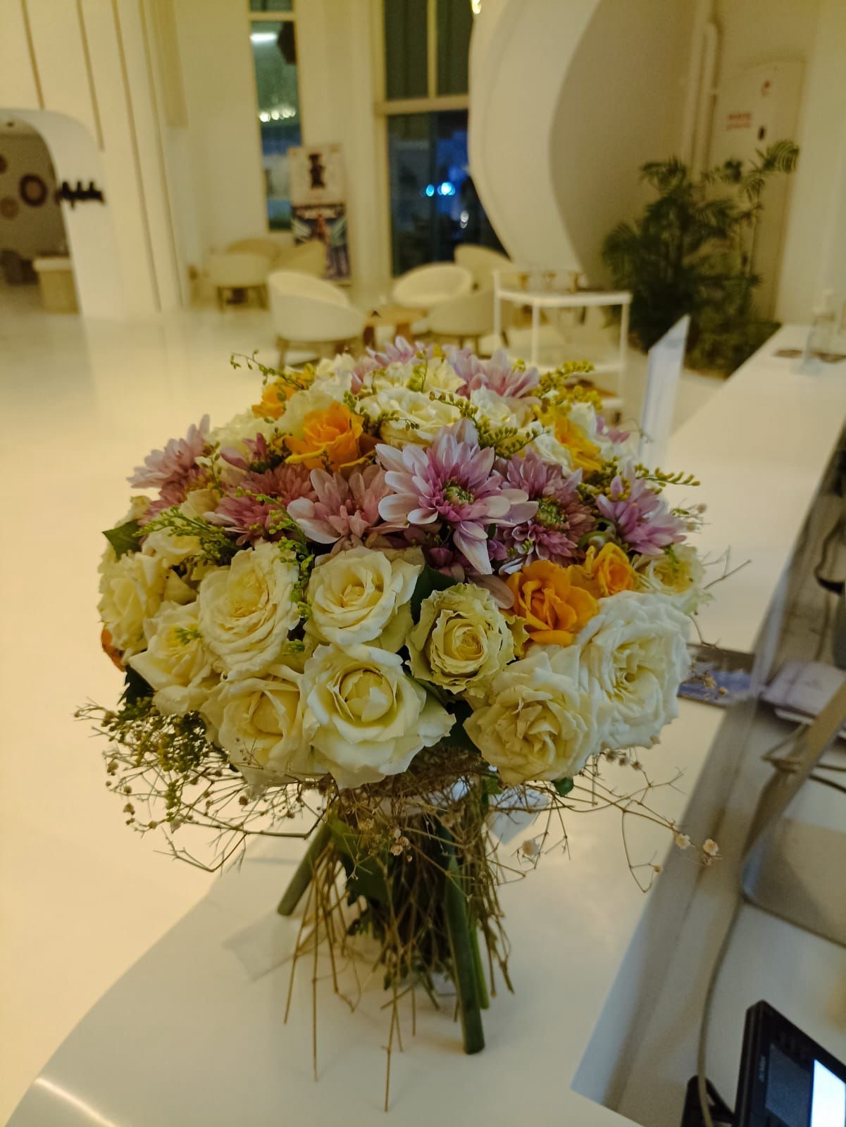 Авторский букет из 33 белых роз и сиреневых хризантем с декоративной зеленью.