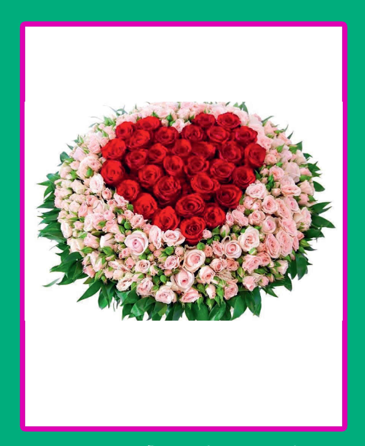 Потрясающее сердце в центре, красиво выполненное из 71 красной и розовой розы.