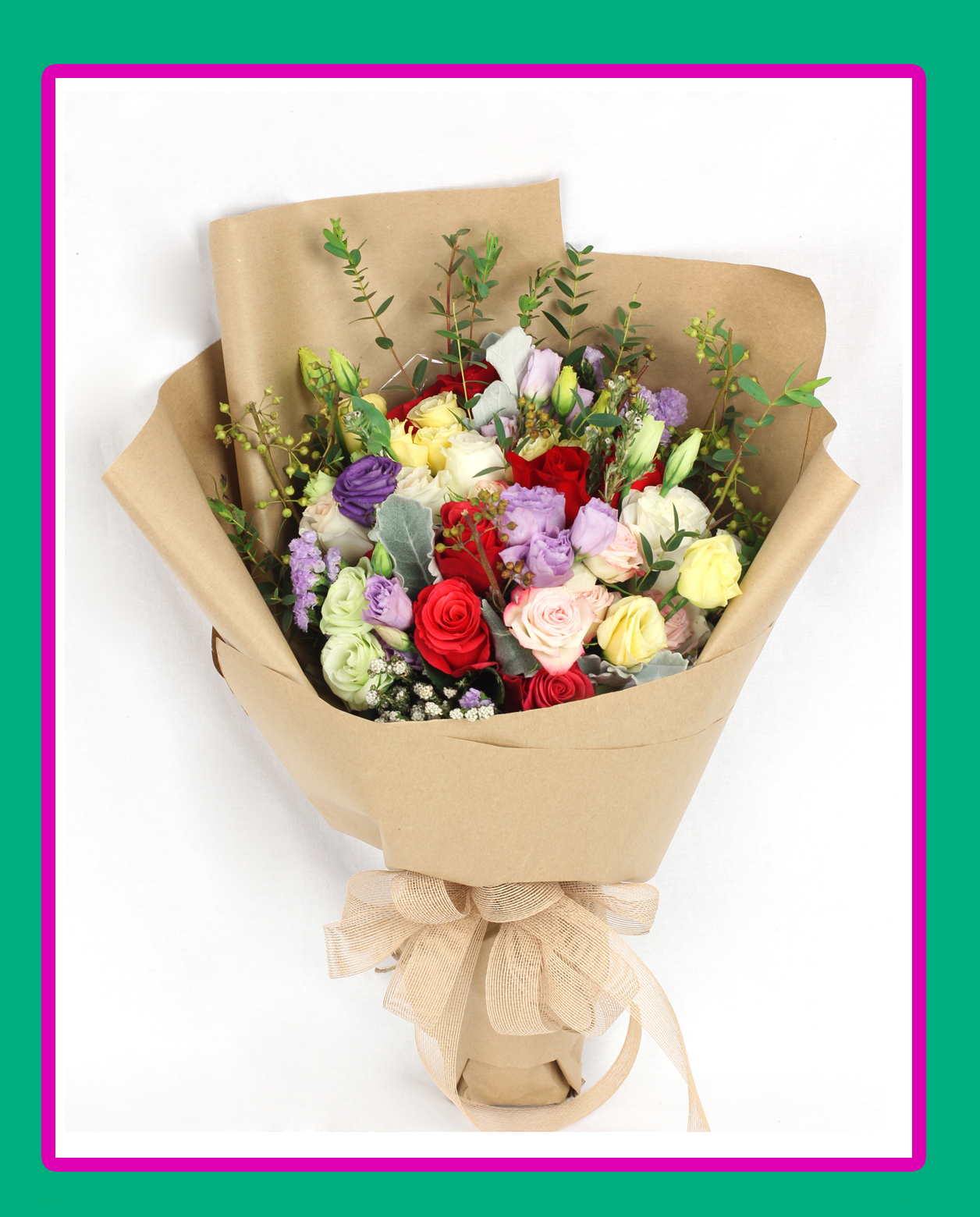 Прекрасный сорт разноцветных роз в прекрасном ручном букете из 15 штук.