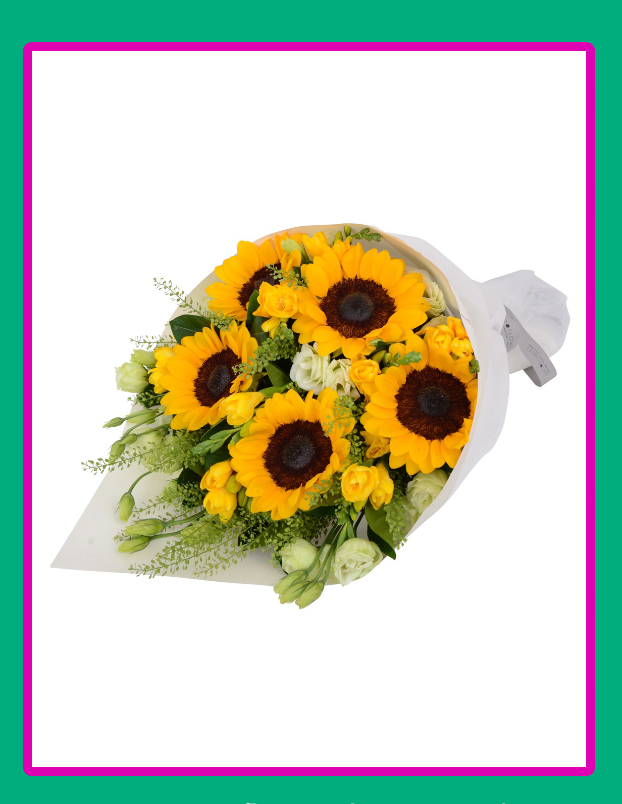 Очень солнечный букет из 9 подсолнухов и белых роз.