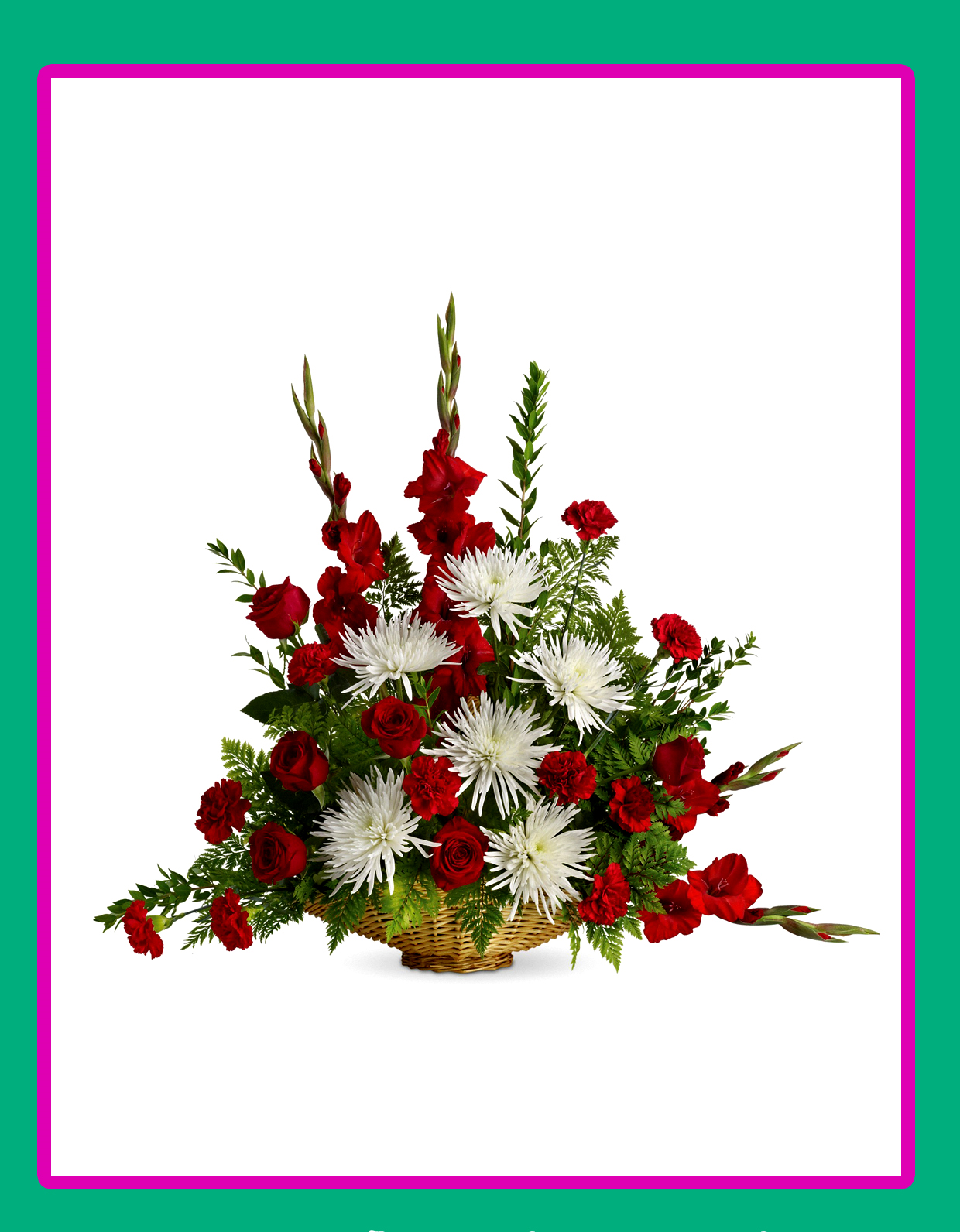 A very classy bouquet of 35 pieces of red Gladioluses with white Chrysanthemums, carefully arranged in a basket.