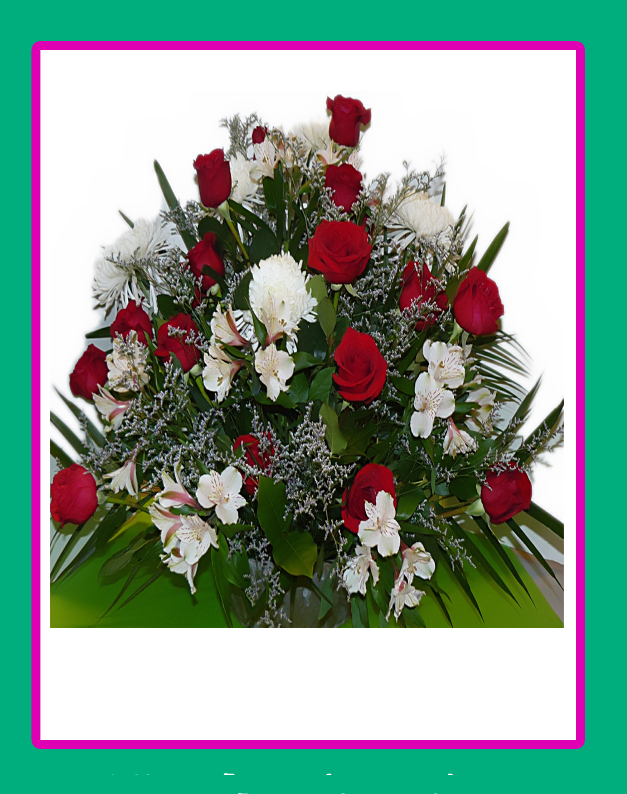 A round bouquet in a vase, carefully crafted from red Roses, white Lillies and decoration flowers, 35 pieces.