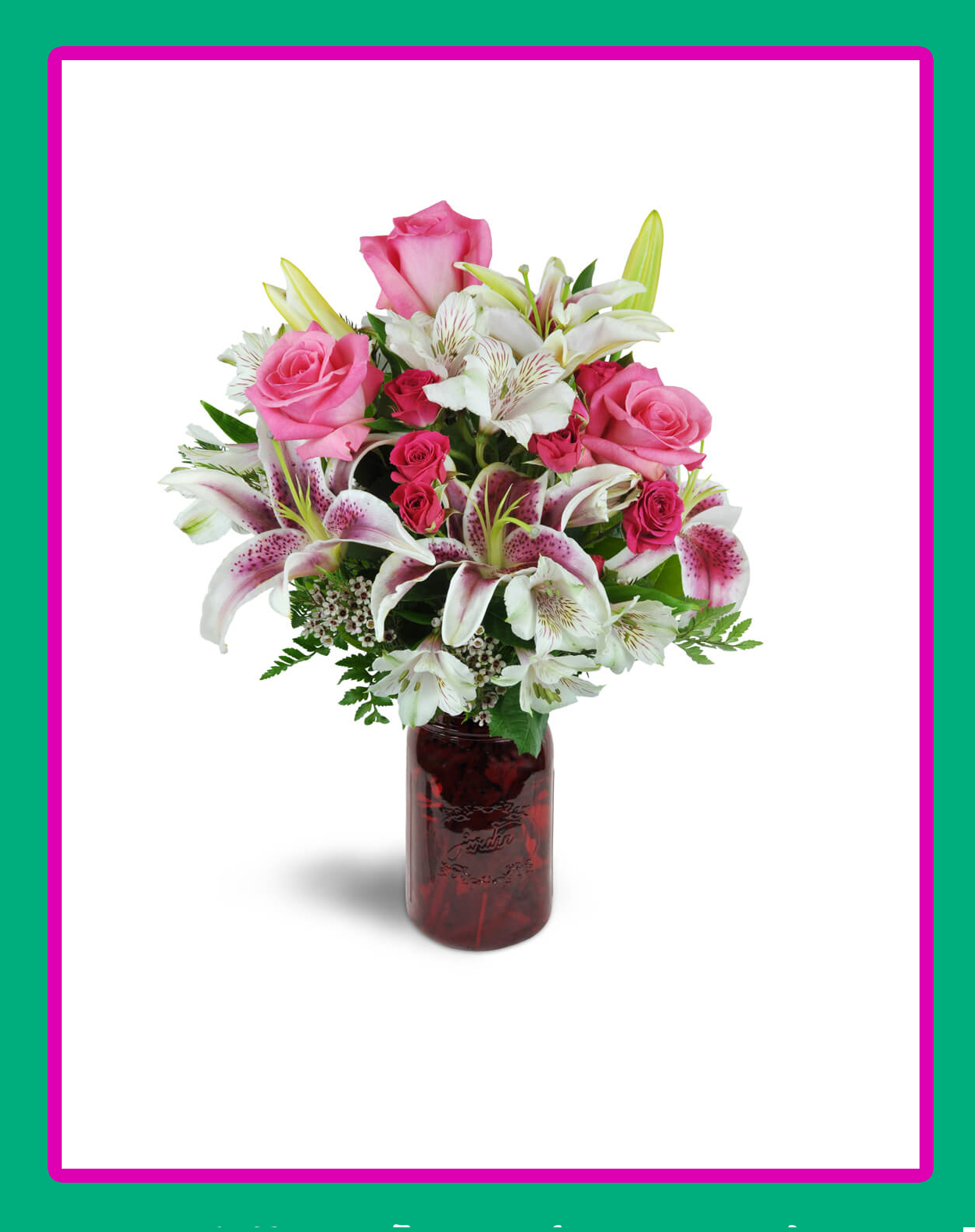 Прекрасный букет в вазе из 15 розовых роз, орхидей и лилий.