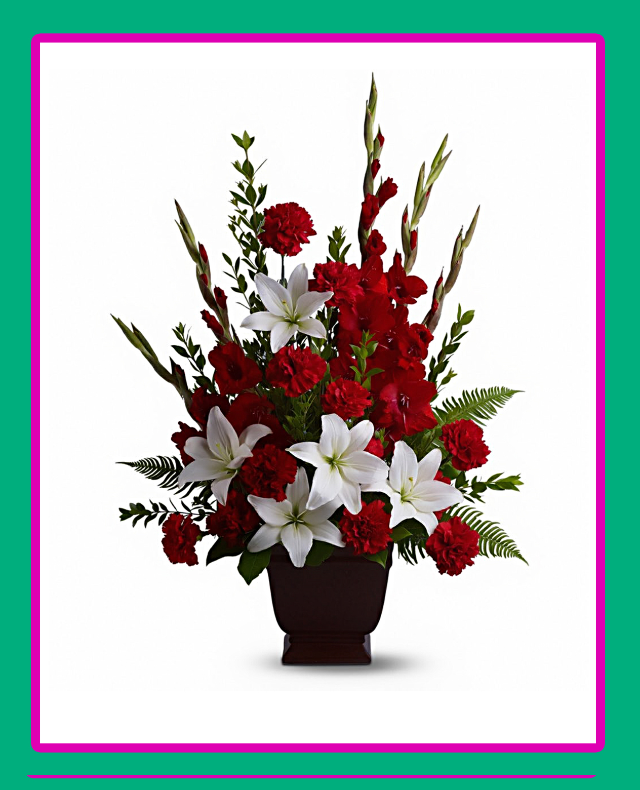 Красивое сочетание красного и белого цветов: красные гладиолусы, красные розы и белые лилии в вазе, выполненные в виде круглой композиции из 25 штук в вазе.